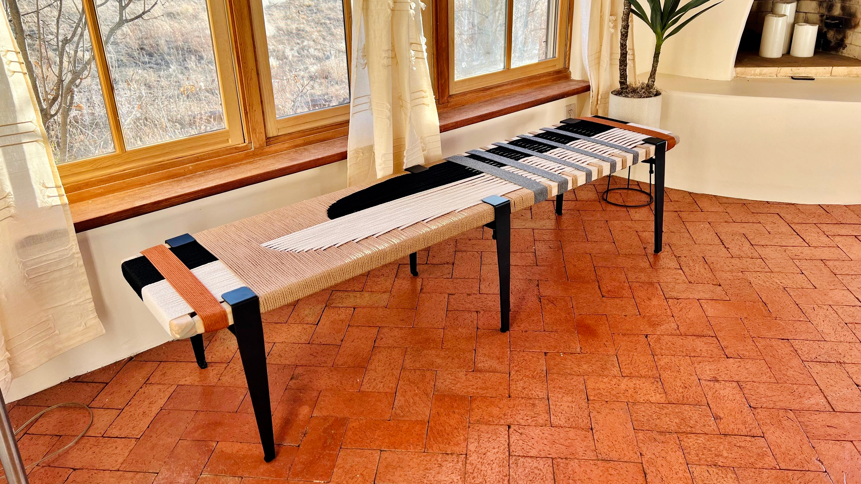 Mid Century Bench | Custom Size Woven Entryway Seating With Matte Black Legs