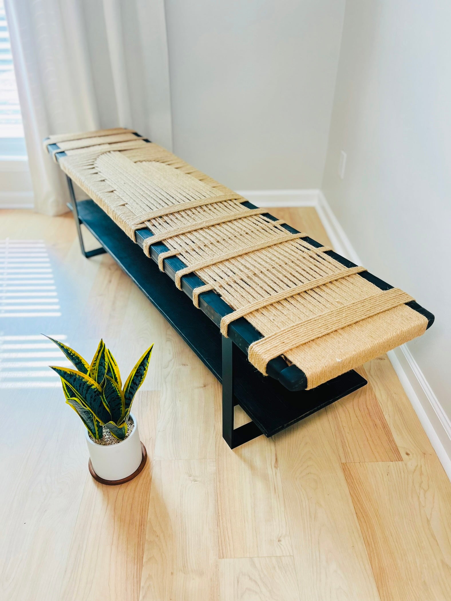 Mid Century Bench | Custom Size Woven Entryway Seating With Matte Black Legs